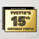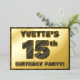 The front of this bold fifteenth birthday celebration/party foil invitation card features a customisable name, a large number “15th”, the message “BIRTHDAY PARTY!”, and a border, all featuring a rustic, yet sophisticated, faux wood grain appearance inspired pattern. The back features personalised details about the event, such as the date, time, location, and any other information that may be useful. Customisable invitations like these might be used to invite guests/attendees to a birthday gathering being held to celebrate somebody’s 15th birthday. [~Z0000595]
