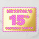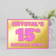 The front of this fun and bold fifteenth birthday celebration foil invitation/announcement card features a personalised name, a large number “15th”, the message “BIRTHDAY PARTY!”, and a border, all featuring a girly light pink and dark pink striped pattern. The back features personalised details about the event, such as the date, time, place/venue, and any other useful information. Personalised invitations like these might be used to invite guests/attendees to a birthday party being held to celebrate somebody’s 15th birthday. [~Z0000597]