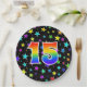 This cheerful, fun, and colourful paper plate design features a large number "15" having a rainbow spectrum gradient inspired pattern colouring. The background features a colourful star shapes pattern. Paper plates like this might be used when celebrating somebody’s fifteenth birthday, or a couple’s 15th anniversary, or some other fifteenth event. [~Z0000493]