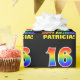 This cheerful, colourful, and fun birthday themed wrapping paper design features a large number "16" and the message "HAPPY BIRTHDAY,", both coloured with a rainbow spectrum gradient inspired pattern, along with a bold yellow personalised recipient name. The background is coloured black. Fun wrapping paper like this might be used when giving a gift or present in honour of somebody’s 16th birthday. [~Z0000475]