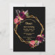 On front: An invitation for a 16th birthday party. A chic black background with a faux gold geometric frame. Decorated with dark burgundy and pink flowers, roses and boho style feathers. Templates for a name and party details. The name is written with a hand lettered style script, golden coloured letters.