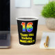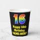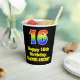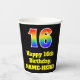 This exciting and fun birthday paper cup design features a large number “16” having a rainbow spectrum gradient inspired pattern. It also features the message “Happy 16th Birthday,”, and a personalised name. The background is coloured black. Colourful, vibrant paper cups like this might be fun to have at a birthday celebration being held to celebrate somebody’s sixteenth birthday. [~Z0000537]