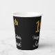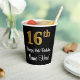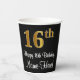 This stylish, elegant, and sophisticated birthday themed paper cup design features a large ordinal number “16th” having a faux/imitation gold-inspired gradient pattern, in addition to the birthday greeting message “Happy 16th Birthday,” and a personalised name in a script-style font. It also has a black-coloured background. Stylish paper cups like this might be fun to use at a birthday party in honour of somebody’s sixteenth birthday. [~Z0000538]
