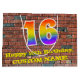 This fun and colourful birthday gift bag design, inspired by graffiti and urban art, features a large number "16" having a rainbow spectrum gradient inspired pattern. It also features the message "Happy 16th Birthday,", and a custom name. The background features a brick wall style pattern. A birthday themed gift-bag like this might be a fun way to wrap a gift or present being given to somebody who is celebrating their 16th birthday. [~Z0000522]