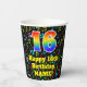 This cheerful and exciting music-themed birthday paper cup design features a large number “16” with a rainbow spectrum gradient inspired pattern, along with the message “Happy 16th Birthday,”, and a customisable name. The background features an exciting and colourful pattern of various music notes and symbols having a variety of sizes and colours. Vibrant, colourful paper cups like this might be fun to have at a birthday celebration/party being held in celebration of somebody’s sixteenth birthday. [~Z0000541]