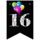 Bold 16 number in black and white design on black background with colourful balloons for 16th birthday party
