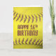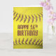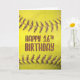 Extreme closeup of a yellow softball with reddish brown stitching for 16th birthday.