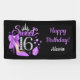 Editable name. Sweet 16th Birthday design. 16th Birthday design for girls, young ladies, teens. Featuring PRINTED tiara/crown, high heel shoe, cupcake and number 16 design. Purple on black.