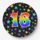 This fun, cheerful, and colourful paper plate design features a large number "16" coloured with a rainbow spectrum gradient inspired pattern. The background features a pattern of colourful star shapes. Paper plates like this might be used at a party celebrating somebody’s sixteenth birthday, or a couple’s sixteenth anniversary, or some other 16th event. [~Z0000493]