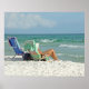 16x20 print watercolor painting showing a woman reading a book in a beach chair as the waves roll in on the shore.