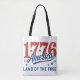 Celebrate this extra special milestone Independence day with an anniversary tote! This tote features the year 1776 in bold red letters with navy blue lettering that says "America land of the free." Perfect for celebrating the 250th anniversary of America.