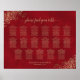 This 17 table crimson red and gold wedding seating chart features a simple yet elegant design with a fancy script calligraphy title and ornate golden faux foil frills in the corners. There is space for 170 guests with 10 seats per table, and the names of the couple and wedding date appear at the bottom. Stylish, sophisticated, and glam, this seating chart will add grace and beauty to your reception while making it easy for your guests to find their tables.