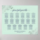 This seating chart contains table assignments for 170 guests at 17 tables, 10 guests per table. The design is simple yet elegant with navy blue text on a light green or neo mint coloured background and silver grey faux foil lacy frills in the corners. Beautiful way to help your guests find the right table at your wedding reception. The title reads "please find your table" in elegant script calligraphy.