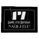 This Roaring '20s look inspired vintage style birthday-themed giftbag design features a large art deco look inspired number "17", the message "Happy 17th Birthday,", a custom name, and a border pattern consisting of thin lines. It features a black-coloured background. A birthday themed gift bag like this might be used when giving a gift or present in celebration of somebody’s 17th birthday. [~Z0000495]