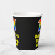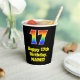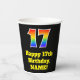 This colourful and fun birthday themed paper cup design features a large number “17” with a rainbow spectrum gradient inspired pattern, along with the message “Happy 17th Birthday,”, and a personalised name. It also has a black-coloured background. Colourful, vibrant paper cups like this might be fun to use at a birthday party/celebration being held to celebrate somebody’s seventeenth birthday. [~Z0000537]