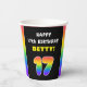 This fun and upbeat birthday-themed paper cup design features a big number “17“ with a multicolor rainbow spectrum inspired gradient pattern, along with the message “HAPPY 17th BIRTHDAY,”, and a custom recipient name. Birthday themed paper cups like this might be a fun way to celebrate somebody’s 17th birthday. [~Z0000639]