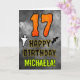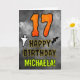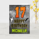 The front of this spooky and scary Halloween themed birthday greeting card design features a large number “17”, along with the message “HAPPY BIRTHDAY,”, and a customisable name. There are also depictions of a bat and a ghost on the front. The inside features a custom birthday greeting message, or could perhaps be cleared and left blank if a message is to be written by hand instead. A personalised birthday card like this might be a fun way to send a message in celebration of somebody’s seventeenth birthday that also falls on Halloween (October 31st). [~Z0000547]