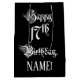 This formal and opulent birthday themed gift bag design features the message “Happy 17th Birthday,” in lavish script style text, on a black coloured background. It also features a personalised recipient name. An elaborate gift bag like this might be a respectable way of wrapping a birthday present or gift being given to somebody who is celebrating their 17th birthday. [~Z0000557]