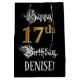 This opulent and ornate birthday-themed giftbag design features the message “Happy 17th Birthday,”, plus a custom recipient name. Some of the message is in an elegant script-style text. The large number “17th” features a faux/imitation gold-inspired look pattern. The background is coloured black. An elaborate gift bag like this might be used when giving a gift or present in honour of somebody’s 17th birthday. [~Z0000560]