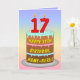 This joyful and colourful birthday-themed greeting card design features a cartoon-style depiction of a three-tier birthday cake having number-shaped candles on top showing the age “17“, along with the message “HAPPY 17TH BIRTHDAY,”, and a custom recipient name. The background of the front features a multicolored pastel rainbow spectrum inspired gradient pattern. The inside features a personalised birthday greeting message, or could perhaps be cleared and left blank if a message is to be written by hand instead. A cheerful, editable birthday greeting card like this might be sent in celebration of somebody’s seventeenth birthday. [~Z0000625]