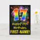 The front of this colourful, fun, and exciting birthday greeting card design features a large number "17" with a rainbow spectrum gradient inspired pattern, along with the message "Happy 17th Birthday,", and a custom recipient name. The front additionally features a colourful background pattern inspired by the look of bursting celebratory fireworks. The inside features a custom birthday greeting message, or could perhaps be cleared and left blank if a message is to be written by hand instead. A customisable birthday card like this might be a fun way to send a message in celebration of somebody’s seventeenth birthday. [~Z0000442]