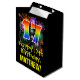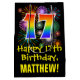 This exciting, fun, and colourful birthday gift bag design features a large number "17" with a rainbow spectrum gradient inspired pattern, along with the message "Happy 17th Birthday,", and a customisable recipient name. It also features a colourful background pattern inspired by the look of bursting celebratory fireworks. A giftbag like this might be used when giving a gift or present in honour of somebody’s seventeenth birthday. [~Z0000509]