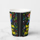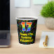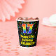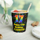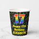 This exciting and cheerful music themed birthday paper cup design features a large number “17” with a rainbow spectrum gradient inspired pattern, along with the message “Happy 17th Birthday,”, and a personalised name. The background features a colourful pattern having music notes and symbols of various sizes and colours. Vibrant, colourful paper cups like this might be fun to have at a birthday celebration/party being held to honour somebody’s seventeenth birthday. [~Z0000541]