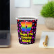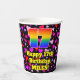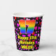 This happy and joyful birthday paper cup design features a large number “17” with a rainbow spectrum gradient inspired pattern, along with the message “Happy 17th Birthday,”, and an editable name. The background features a pattern of heart shapes with colours like purple, pink, and red. Fun, happy paper cups like this might be fun to use at a birthday party being held to celebrate somebody’s seventeenth birthday. [~Z0000548]