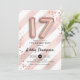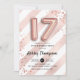 17th birthday party invitation. Elegant design in faux glitter rose gold with stripes. Invite card with rose gold number 17 balloons, script font with confetti. Blush coral pink, white. Perfect for a stylish seventeenth bday celebration. Message me if you need custom age.