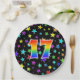 This fun, cheerful, and colourful paper plate design features a large number "17" coloured with a rainbow spectrum gradient inspired pattern. The background features a colourful star shapes pattern. Fun paper plates like this might be used at somebody’s seventeenth birthday party, or a couple’s 17th anniversary celebration, or some other seventeenth event. [~Z0000493]