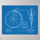 1887 Vintage high wheeler or Penny farthing bicycle US patent technical design illustration. Pedal drive with side handlebars. Star pattern wheel spokes.