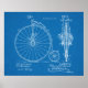 1887 Vintage high wheeler or Penny farthing bicycle US patent technical design illustration. Pedal drive with double gearing