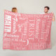 18 Extraordinary Life Wishes for someone special. Perfect fleece blanket for the bedroom, living room, dorm room, and game room. Beautiful wishes for eighteen blessings of a wonderful life. Customisable Design Wishing: Prosperity, Trust, Belief, Happiness, Fun, Knowledge, Health, Courage, Wisdom, Strength, Dreams, Joy, Beauty, Family, Patience, Friends, Love, and Grace. Each word is easy to change colour lettering, spelling and background colour or add your photo.. Great Gifts for Everyone. Beautiful with names, phrases or travel destinations also.