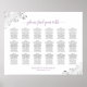 This seating chart will help your guests find their assigned tables at your wedding reception. It features a simple yet elegant design with dark gray and light purple or lavender text on a white background. The title is written in beautiful script calligraphy lettering and reads: please find your table. The design features a lacy floral faux foil silver filigree in the corners. Contains seating assignments for 18 tables at 10 guests per table or 180 guests.