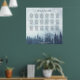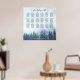 This rustic yet elegant wedding seating chart has table assignments for 180 guests at 18 tables (10 people per table.) The design features a mountain scene with a misty hillside covered in a blue spruce or pine tree forest. There is a lacy script calligraphy title reading "please find your table" as well as space for the names of the couple and the wedding date. Perfect for an outdoor or wilderness destination wedding.
