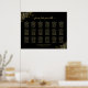 This seating chart will help your guests find their assigned tables at your wedding reception. It features a simple yet elegant design with gold text on a black background. The title is written in beautiful script calligraphy lettering and reads: please find your table. The design features a lacy floral faux foil gold filigree in the corners. Contains seating assignments for 18 tables at 10 guests per table or 180 guests.