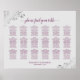 This seating chart will help your guests find their assigned tables at your wedding reception. It features a simple yet elegant design with cassis purple or magenta text on a grey background. The title is written in beautiful script calligraphy lettering and reads: please find your table. The design features a lacy floral faux foil silver filigree in the corners. Contains seating assignments for 18 tables at 10 guests per table or 180 guests.