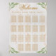 The wedding seating chart has 18 tables. In all four corners, there are willow branches with green leaves.