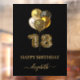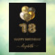 For a girly and glamourous 18th birthday party. A black background, decorated with balloons. With the text: Happy Birthday. Personalise and add a name. The name is written in dark rose gold with a modern hand lettered style script with swashes. Number 18 is written with a trendy balloon style font, leopard pattern. To keep the swashes only delete the sample name, leave the spaces or emoji's in front and after the name.
