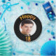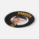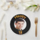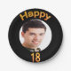 A paper plate for a 18th birthday party for guys. Template for your photo. Black background and the text: Happy 18. The text is written with a trendy faux gold balloon script.