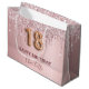 Elegant, classic, glamourous and girly for a 18th birthday party. A chic blush pink gradient background. Decorated with faux glitter drips, paint dripping look. Personalise and add a name. With the text: Happy Birthday. The name is written with a modern dark rose coloured hand lettered style script. Number 18 is written with a balloon style font.