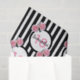 Classic slim black and white vertical stripes as background. With girly, feminine and romantic pink roses as decoration. Perfect for an elegant 18th birthday party for her. White and black frames with templates for name and age. Age number 18 in pink, name and date in black. The name is written with a hand-lettered style script.