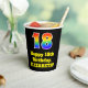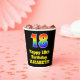 This fun and exciting birthday paper cup design features a large number “18” having a rainbow spectrum gradient inspired pattern. It also features the message “Happy 18th Birthday,”, and an editable name. The background is coloured black. Colourful, vibrant paper cups like this might be fun to have at a birthday party being held in celebration of somebody’s 18th birthday. [~Z0000537]