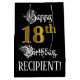 This elegant and ornate birthday giftbag design features the message “Happy 18th Birthday,”, and a personalised recipient name. Part of the message is in a luxurious script-style text, the large number “18th” features a faux/imitation gold-inspired look pattern, and the background is coloured black. A birthday themed giftbag like this might be a respectable way to wrap a gift or present being given to somebody who is celebrating their eighteenth birthday. [~Z0000560]