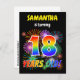 The front of this exciting and lively birthday party invitation postcard design has a customisable name, a vibrant bursting celebratory fireworks inspired pattern, and the message "18 YEARS OLD!" having a colourful rainbow spectrum inspired gradient pattern. The back features an editable message that could include details about the birthday party, such as when it is happening and where it is being held. Invitation postcards like this might be sent to potential attendees of a birthday party being held in celebration of somebody’s eighteenth birthday. [~Z0000452]