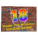 This colourful and fun birthday themed gift bag design, inspired by street art, features a large number "18" having a rainbow spectrum gradient inspired pattern. It also features the message "Happy 18th Birthday,", and a personalised name. It also has a brick wall style pattern background. A gift bag like this might be used when wrapping gifts being given to somebody in celebration of their 18th birthday. [~Z0000522]
