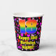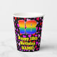 This fun and happy birthday themed paper cup design features a large number “18” having a rainbow spectrum gradient inspired pattern. It also features the message “Happy 18th Birthday,”, and a customisable name. The background features a pattern of red, pink, and purple heart shapes. Cheerful, joyful paper cups like this might be fun to use at a birthday party being held in celebration of somebody’s eighteenth birthday. [~Z0000548]
