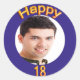 A sticker for a 18th birthday party for guys. Template for your photo. Blue background and the text: Happy 18. The text is written with a trendy faux gold balloon script.