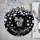 An elegant and glamourous black and white paper plate for a 18th birthday party for a girl. A chic black coloured background. A black coloured circle with modern hand lettered style text: Hello 18! Faux diamonds as decoration. Template for a name and a date, curved text.