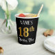 This ornate and opulent birthday themed paper cup design features a customisable name and the message “18th Birthday Party”. The large number “18th” has an imitation/faux gold-inspired colouring pattern, the words “Birthday Party” are in fancy script-style text, and the background is coloured black by default (although it can be customised). Elegant, luxurious paper cups like this might be used at a birthday celebration being held in celebration of somebody’s eighteenth birthday. [~Z0000567]